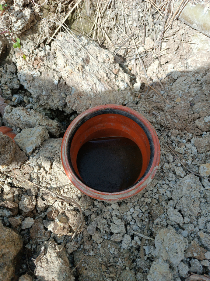 A tisztító idomot megtaláltuk a kerítéstől kb 1,5 m-re, azonban a fotón is látható, hogy nagyjából félszelvényig fel volt telve a csatorna hordalékkal. Szomorú, de erre csak egy megoldás van. A lefektetett csővezetéket kiásni, megfelelően tömörített homokágyba újraszintezve megépíteni, majd visszatakarni.